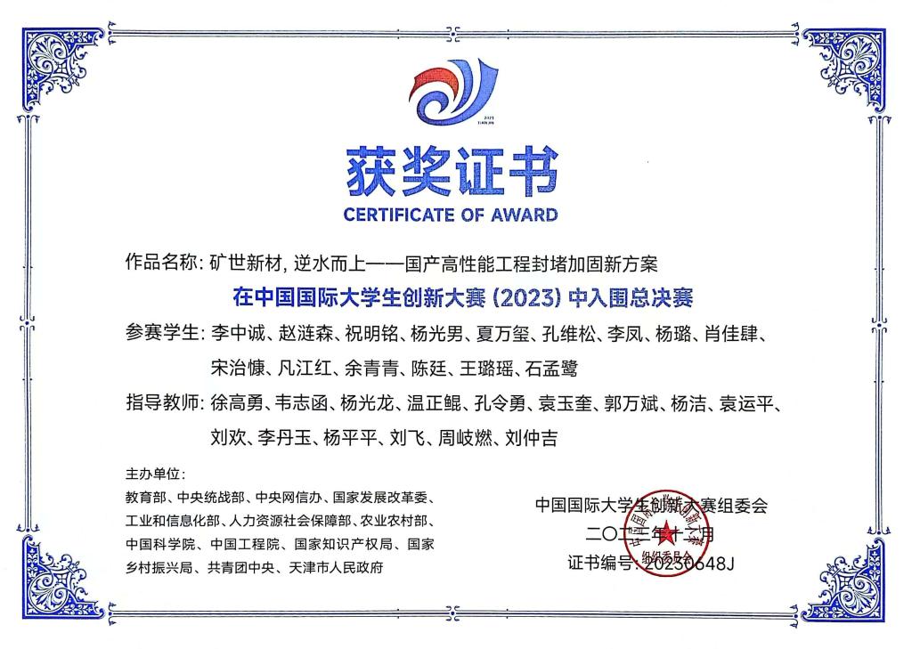 由教育部、中央统战部、中央网信办、国家发展改革委、工业和信息化部、人力资源社会保障部、农业农村部、中国科学院、中国工程院、国家知识产权局、国家乡村振兴局、共青团中央和天津市人民政府共同主办,天津大学承办的中国国际大学生创新大赛(2023)在天津大学举行。我校“矿世新材,逆水而上--国产高性能工程封堵加固新方案”项目入围总决赛。